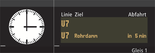 | Das Dynamische Auskunfts- und Informationssystem (DAISY) ist auf allen U-Bahnhöfen zu finden. Es zeigt dem Fahrgast an, wann der nächste Zug in welche Richtung an- bzw. abfährt. Steht der Zug bereits im Bahnhof, blinkt die Anzeige im Sekundentakt. Gesteuert wird DAISY durch den sogennanten Sollfahrplan und dem tatsächlichen Istwert. Die zweite Zeile zeigt entweder den darauffolgenden Zug, Informationen über betriebliche Störungen oder Besonderheiten an. Der Hersteller war SIEMENS. |
